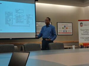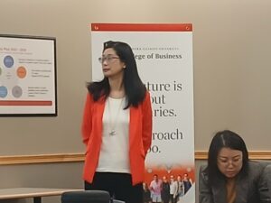 On Friday, Nov. 15, College of Business Dean Joan Phillips-Hernandez hosted a research seminar featuring Management Professor Mahesh Subramony and Marketing Associate Professor Elina Tang, who presented to fellow faculty and staff members on the topic of “Technology and the Future of Work.”